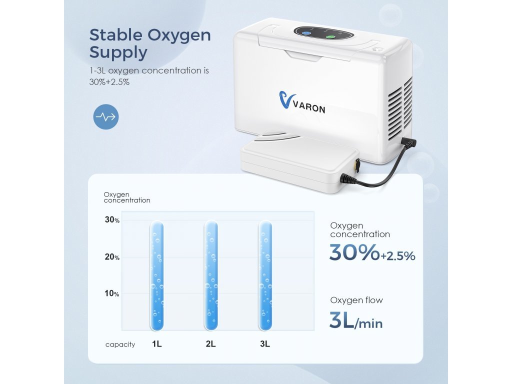 VARON NT05, hordozható oxigén koncentrátor, akkumulátoros, 1.4 kg, 30W, folyamatos áramlás, 32%